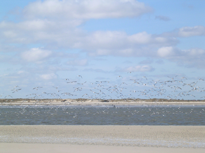 Wenn es also jemand wissen will, warum ich immer wieder auf 'meine' Insel muss, dann erzähle ich folgendes: Endlich Urlaub!!! Am Abend vor der Abfahrt wird der Koffer gepackt. Das dauert nie lange, denn es ist schon Routine was hinein gepackt wird. Dann versucht man zu schlafen, doch vor lauter Vorfreude wird nicht viel davon. Endlich ist es Zeit aufzustehen und schon geht´s los. Rauf auf die Autobahn...runter von der Autobahn...durch die Dörfer nach Neßmersiel. Und wenn man dann über den Deich fährt und den Hafen sieht (bei klarer Sicht auch die Insel) fängt es im Magen wie verrückt zu kribbeln an, ich lache laut auf vor Freude und rufe: "Da ist sie!" Schnell wird noch der Wagen abgegeben und dann lässt man alles hinter sich. Schon die Atmosphäre während der Überfahrt mit einer der Baltrum-Fähren ist genial. Alle sind entspannt und gut drauf! Jetzt gibt es erstmal einen steifen Grog (wir fahren meistens zur kalten Jahreszeit) und man genießt die Fahrt vorbei an der Seehundbank (Norderney) in dem Wissen was einen erwartet. Wenn die Fähre anlegt, geht das Kribbeln im Bauch wieder los!!! Wir werden immer herzlich begrüßt und schon sieht man auch die ersten bekannten Insulanergesichter. Es ist als würde man nach Hause kommen. Es klingt vielleicht komisch, aber so wie man auf der Insel ist, strömt diese Ruhe in einen hinein und selbst wenn wirklich viele Menschen am Hafen sind, gibt es keine Hektik. Jeder schnappt sich sein Gepäck und zottelt los - herrlich!!! Wenn wir in unserer Unterkunft -bei Familie Küper im Hus Hörn van Diek- angekommen sind, dann ist das auch immer ein Gefühl von 'Heimat'. Unser Zimmer mit Blick auf die wundervolle See ist einfach 'heimelich'. Die Koffer sind noch schneller ausgepackt als eingepackt und es geht gleich raus an die Luft. Erstmal schauen was es so 'Neues' gibt. Wenn wir nichts entdecken, dann erzählt uns aber auf jedem Fall Frau Küper spätestens beim Frühstück was so los ist. Wir stehen auf Baltrum seltsamerweise schon früh auf. Wahrscheinlich, weil wir möglichst viel vom Tag und der Insel haben wollen. Dann gibt es bei Familie Küper ein köngliches Frühstück und spätestens um 09.30 Uhr sind wir mit der Wegzehrung im Rucksack draußen. Wir gehen immer am Strand (Richtung Osten) los, um die Insel zu umrunden. Am Strand ist es so schön, dass ich davon nie genug bekommen kann. Jeden Tag sieht es dort anders aus! Wenn der Wind über den Strand fegt sieht es aus als würden Nebelschwaden umherziehen, so fein ist der Sand der umherweht. Die Gezeiten zaubern die allerschönsten Muster in den Sand und die Muscheln sehen aus, als hätten sie jede ein Podest für sich. Vor einem liegt der weite Strand, der aussieht als wäre er endlos lang. Die Möven sitzen in Scharen am Wasser und scheinen einen zu begleiten. Immer wenn man sich nähert fliegen sie ein Stückchen weiter, um sich dann einen neuen Platz am Wassersaum zu suchen. Sie lassen sich kreischend nieder und laben sich an kleinen Krebsen und Muscheln. Verschiedene Arten sind zu sehen - z. B. Silbermöwe, Lachmöwe, Dreizehenmöwe, Sturmmöwe-. Die Strandläufer tragen zu Recht ihren Namen. Sie flitzen die ganze Zeit vor einem herum und lassen sich bei ihrer Futtersuche nicht stören. Manchmal hat man Glück und sieht einen Krebs, der den Möwen entkommen ist. Wenn er sich angegriffen fühlt, dann stellt er seine Scheren auf und sieht fast ein wenig Angst einflößend aus. Wenn ich am Strand entlanglaufe, muss ich mich manchmal richtig zwingen auch mal nach vorne zu schauen. Denn alles was am Wasser so herum liegt, scheint meinen Blick immer wieder magisch anzuziehen. Die Vielzahl der Muscheln lässt sich kaum beschreiben, da wirklich jede anders aussieht. Eigentlich dachte ich, dass ich schon jede Muschel einmal zu Hause habe. Was die Art betrifft, stimmt das wohl auch. Aber ich finde immer wieder eine, die sich doch noch von der eigenen Art abhebt. Die Maserungen auf den Wellhornschnecken finde ich besonders interessant. Ich frage mich immer wie lange das Meer und der Sand wohl brauchen, um diese Muster zu erschaffen. Es ist schon toll, was die Natur hervor bringt. Und noch viel schöner ist es, dieses zu entdecken. Apropos entdecken, ich habe ja noch gar nicht vom Bernstein -das Gold der Meere- erzählt, den ich gefunden habe. Ja, das war so: Anfang März 2001 waren mein Mann und ich das erste Mal im 'fast noch Winter' auf Baltrum. Als wir uns morgens beim Bäcker Brötchen holten, kamen wir mit der freundlichen Bedienung ins Gespräch. Sie erzählte uns, dass heute ein guter Tag zum Bernstein suchen wäre. Wir fragten warum, denn wir hatten bisher nicht gewusst, dass er auf Baltrum zu finden ist. Nun war meine Neugierde jedoch geweckt, da ich noch nie im Leben welchen gefunden hatte. Sie erzählte uns, dass der Ostwind günstig war und da auch noch die Sonne schien, sollte man es besonders gut sehen bzw. finden können in dem 'schwarzen Zeug'. Wir fragten welches schwarze Zeug sie wohl meint. Da lächelte sie, denn nun war auch ihr klar, dass wir keinen blassen Schimmer hatten wovon sie redet. Es war ihr eine Freunde uns zu erklären, was es mit dem 'schwarzen Zeug' auf sich hat. Es ist nämlich so, dass Bernstein sehr leicht ist und dieses 'schwarze Zeug' ebenfalls, da es sich um altes Holz handelt. Es wird dann zusammen angespült und wenn dann die Ebbe einsetzt, bleibt der Bernstein darin hängen und wartet von uns gefunden zu werden. Sie meinte noch, dass bestimmt welcher am Hafenstrand zu finden sei. So sind wir also total motiviert losgezogen um Bernstein zu suchen. Auf den Rat der Bedienung haben wir selbstverständlich gehört und unseren Inselrundgang an jenem Tag am Hafen begonnen. Ja und tatsächlich, da lag es überall an der Wassergrenze die die Ebbe zurückgelassen hatte - das 'schwarze Zeug'. Gleich machten wir uns auf den Weg - gegen die Sonne suchend. Herrlich, mit welch einer Begeisterung wir herumstocherten und suchten. Mir taten bald die Augen weh, de